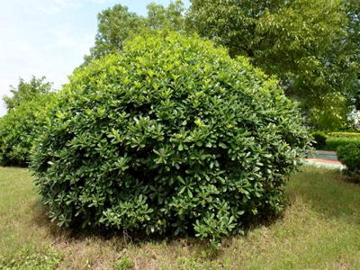 海桐:常绿灌木或小乔木,高达3米。枝叶密生,树冠聊。叶多数聚生枝顶,单叶互生,有时呈轮生状,厚革质狭倒卵形,长5~12厘米,宽1~4厘米,全缘,顶端钝圆或内凹,基部楔形,边缘常略外反卷,有柄,表面亮绿色,新叶黄嫩。聚伞花序顶生;花白色或带黄绿色,芳香,花柄长0.8~1.5厘米;萼片、花瓣、雄蕊各5;子房上位,密生短柔毛。蒴果近球形,有棱角,长达1.5厘米,初为绿色,后变黄色,成熟时3瓣裂,果瓣木质;种子鲜红色,有粘液。花期5月,果熟期9~10月。